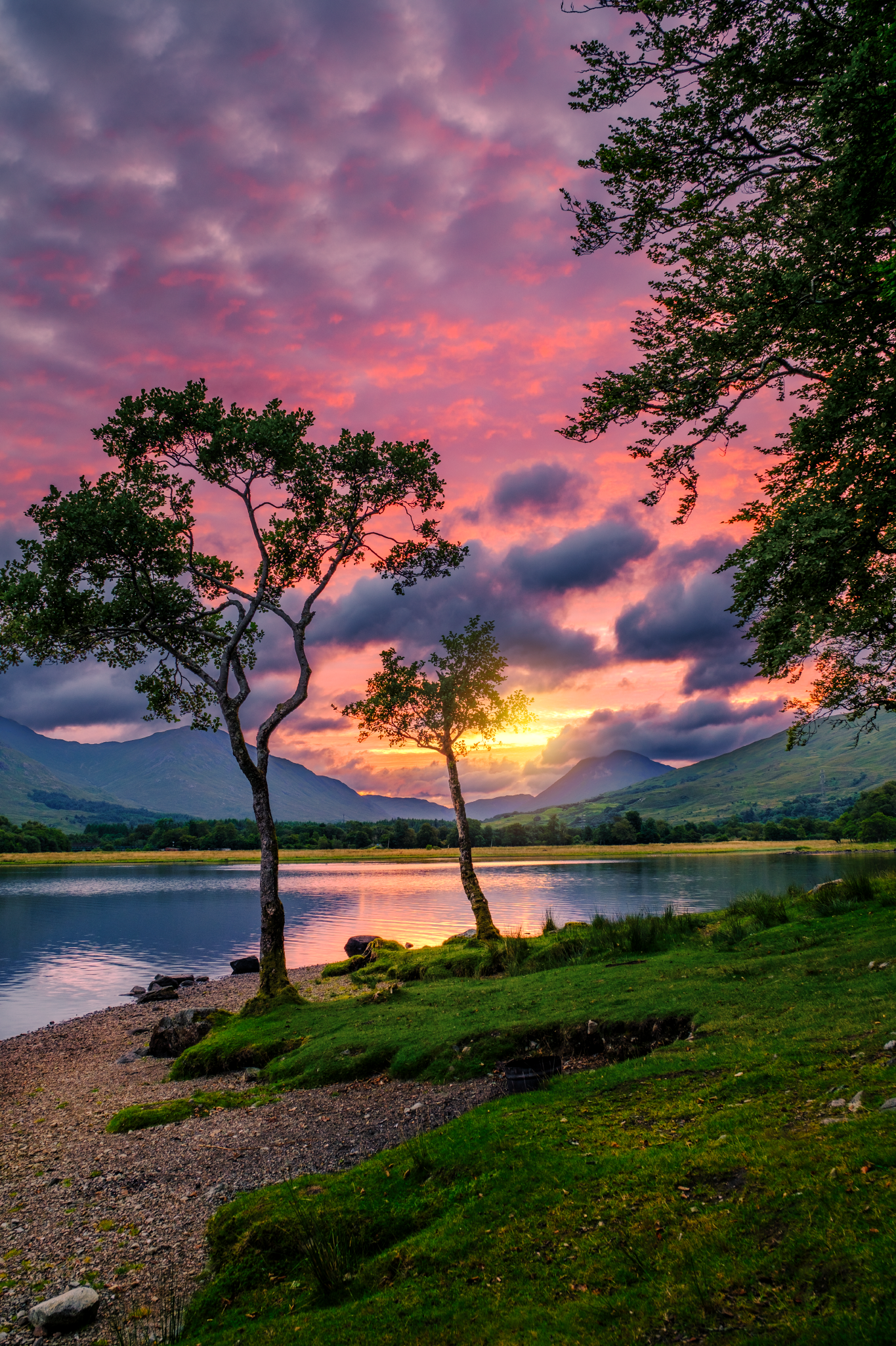 But ultimately, faced with this breathtaking sunrise over the tranquil loch, with its warm, golden light piercing a dramatic sky painted in shades of purple, pink, and blue, I decided to photograph in the direction of the rising sun, without including the castle! The two elegantly curved trees in the foreground added a sense of harmony and balance, with the distant mountains complementing the scene, evoking a feeling of serenity and connection with nature.